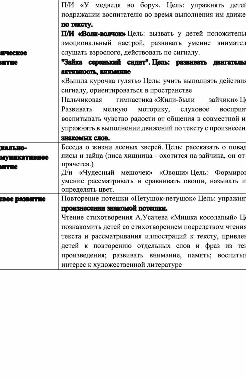 П/И «У медведя во бору». Цель: упражнять детей в подражании воспитателю во время выполнения им движений по тексту. П/И «Волк-волчок» Цель: вызвать у детей положительный эмоциональный настрой, развивать умение внимательно слушать взрослого, действовать по сигналу. "Зайка серенький сидит". Цель: развивать двигательную активность, внимание «Вышла курочка гулять» Цель: учить выполнять действия по сигналу, ориентироваться в пространстве Пальчиковая гимнастика «Жили-были зайчики» Цель: Развивать мелкую моторику, слуховое восприятие, воспитывать чувство радости от общения в совместной игре, упражнять в выполнении движений по тексту с произнесением знакомых слов. |