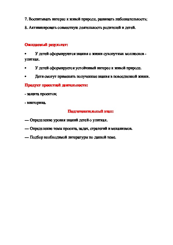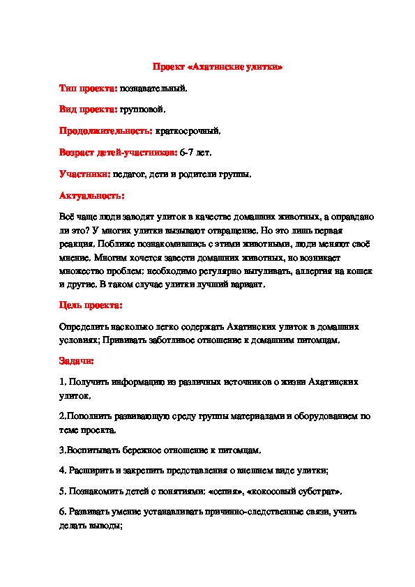 Данный проект позволит , как можно больше узнать о жизни улиток, также определить насколько легко содержать Ахатинских улиток в домашних условиях; пополнить словарный запас, обогатить речь, посредством пословиц, стихотворений. А также тесное сотрудничество педагога с родителями (поиск информации, разработка презентации, приобретение домашнего питомца) позволит сблизить общение детей с родителями.Данный документ содержит цели, задачи, содержание проекта