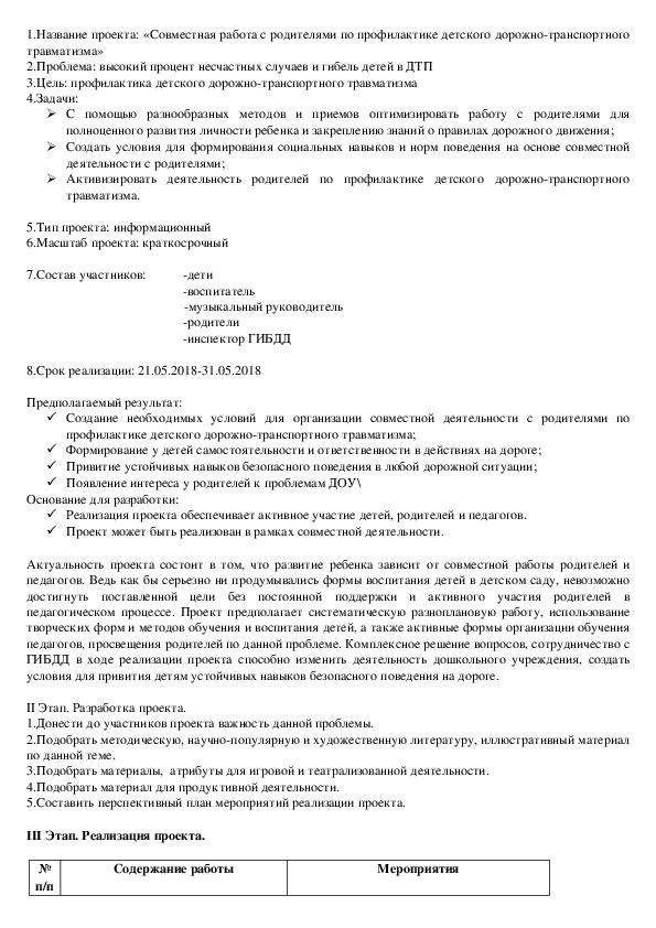 г.Ессентуки, 20181.Название проекта: «Совместная работа с родителями по профилактике детского дорожнотранспортного