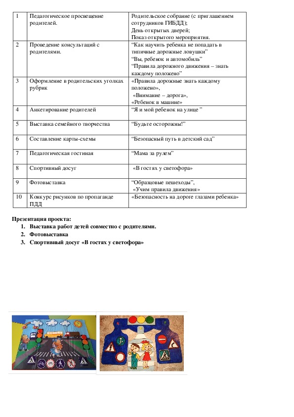 С помощью данного проекта выявить уровень знаний правил дорожного движения у родителей. Напомнить с помощью незатейливых игр состав дорожной аптечки. Совместно с детьми изготовить поделки по ПДД. Познакомить семьи воспитанников с новыми литературными произведениями о правилах дорожного движения, с частушками о знаках.Проект по правилам дорожного движения совместно с родителями.