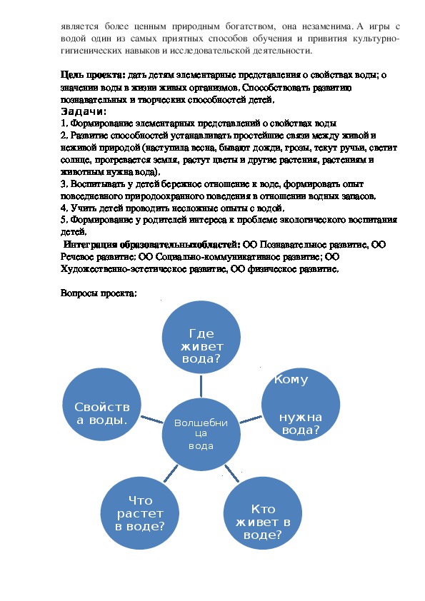 материал содержит разработку (паспорт проекта) "Её Величество - Вода" Цель данного проекта дать детям элементарные представления о свойствах воды; о значении воды в жизни живых организмов. Способствовать развитию познавательных и творческих способностей детей. Проект направлен на вовлечение родителей в образовательный процесс ДОУ.