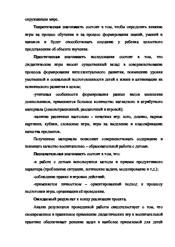 Дидактическая игра важна и для того, чтобы сделать его настоящую жизнь полной и счастливой. Руководя игрой, педагог воспитывает активное стремление делать что-то, узнавать, искать, проявлять усилие и находить, обогащать духовный мир детей. А это всё содействует умственному и общему развитию. Этой цели и служат дидактические игры.