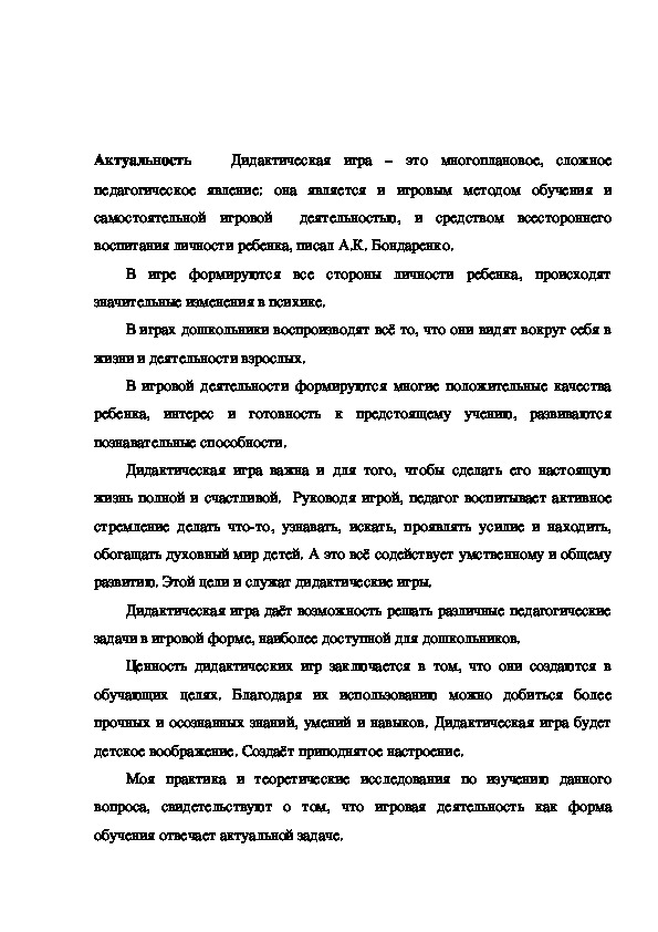 Актуальность Дидактическая игра – это многоплановое, сложное педагогическое явление: она является и игровым методом обучения и самостоятельной игровой деятельностью, и средством всестороннего воспитания личности ребенка, писал А.К. Бондаренко.
