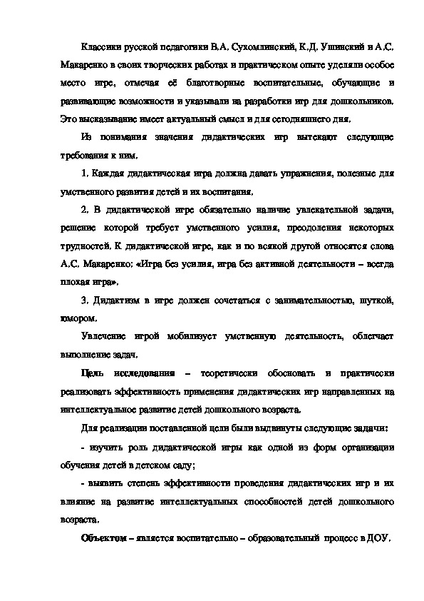 Классики русской педагогики В.А. Сухомлинский, К.Д. Ушинский и А.С. Макаренко в своих творческих работах и практическом опыте уделяли особое место игре, отмечая её благотворные воспитательные, обучающие и развивающие возможности и указывали на разработки игр для дошкольников. Это высказывание имеет актуальный смысл и для сегодняшнего дня.