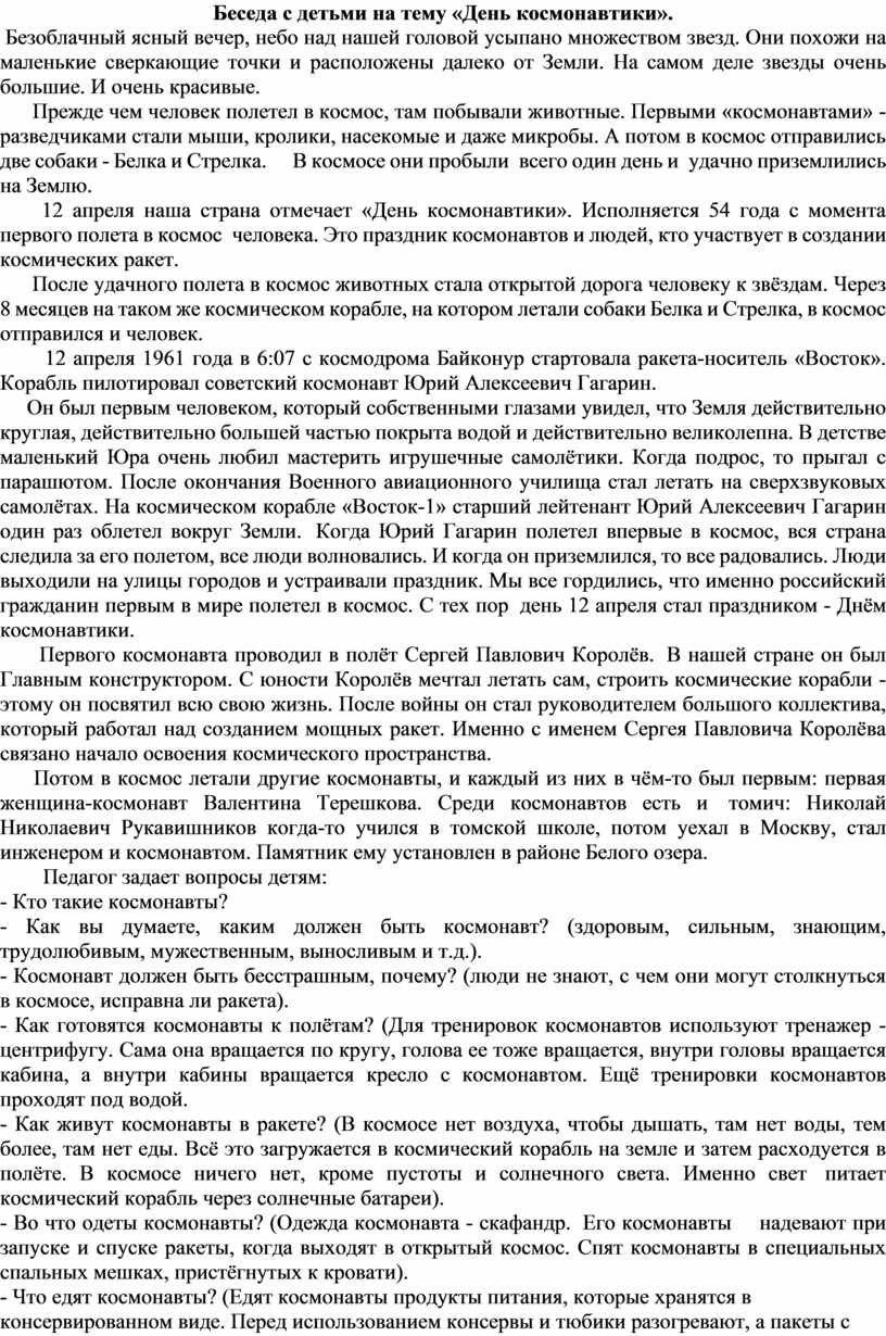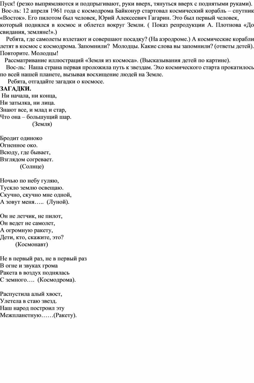 Материал к занятию: иллюстрации: «Земля из космоса», «Звездное небо», портрет Юрия Алексеевича Гагарина.