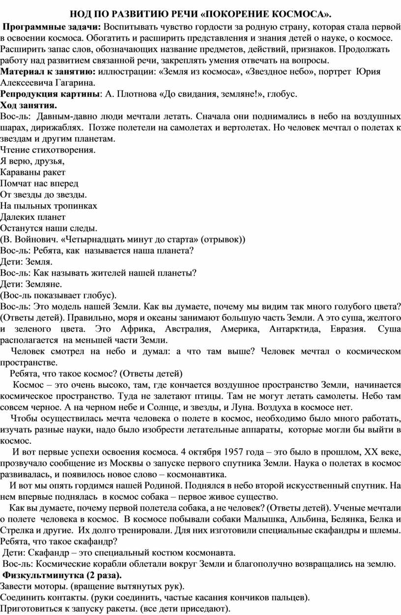 Программные задачи: Воспитывать чувство гордости за родную страну, которая стала первой в освоении космоса. Обогатить и расширить представления и знания детей о науке, о космосе.
