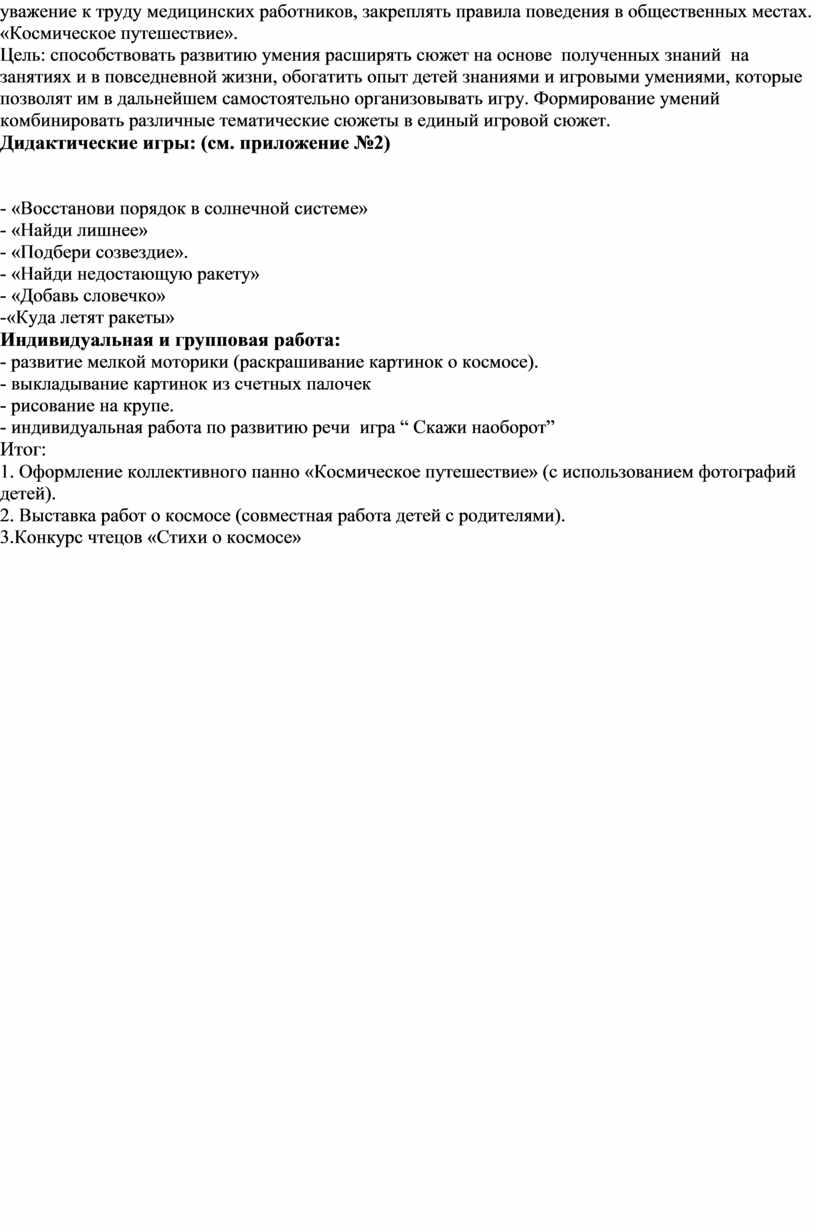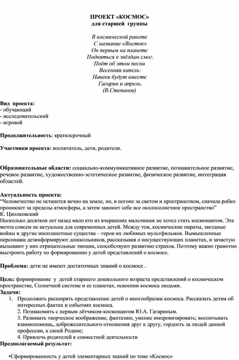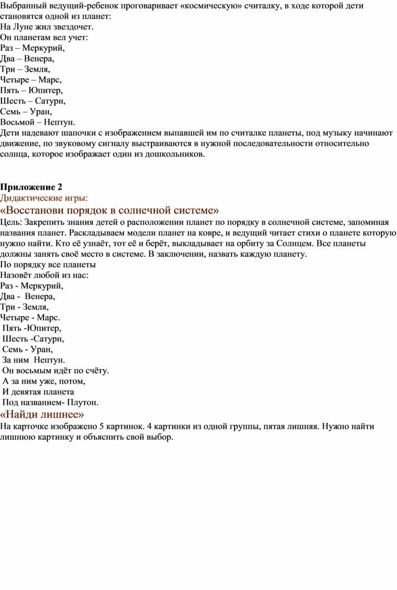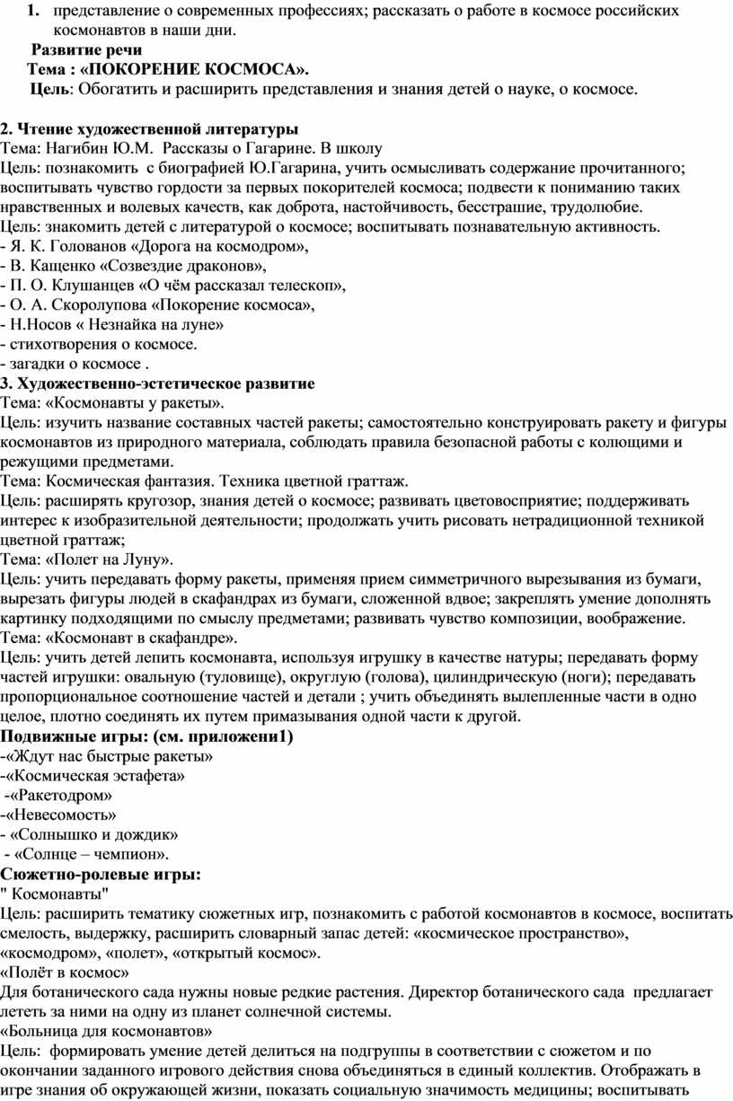 Цель: формирование у детей старшего дошкольного возраста представлений о космическом пространстве, Солнечной системе и ее планетах, освоении космоса людьми.
