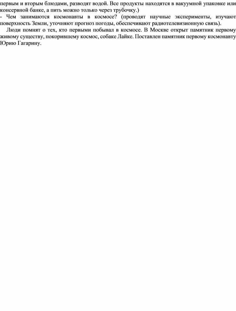 - Что едят космонавты? (Едят космонавты продукты питания, которые хранятся в консервированном виде. Перед использованием консервы и тюбики разогревают, а пакеты с первым и вторым блюдами, разводят водой. Все продукты находятся в вакуумной упаковке или консервной банке, а пить можно только через трубочку.)