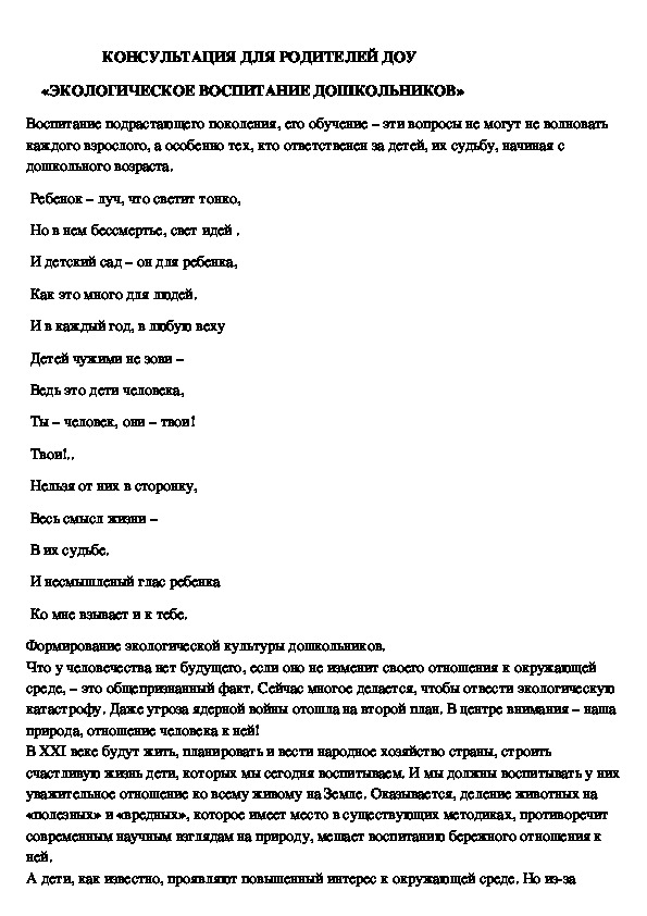 А дети, как известно, проявляют повышенный интерес к окружающей среде. Но иззаотсутствия целенаправленной и единой работы детских садов, семьи и общественности у