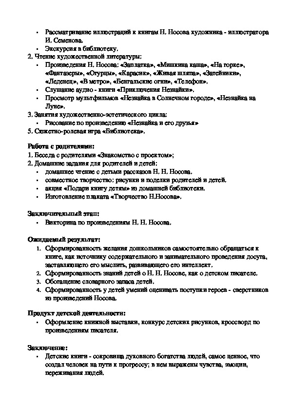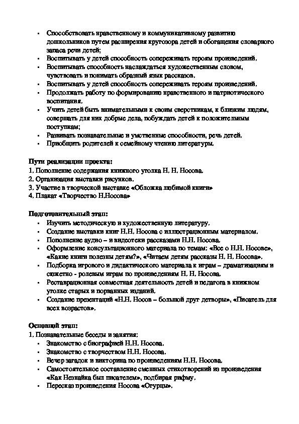 Педагогический проект для детей дошкольного возраста по знакомству с творчеством Николая Николаевича Носова. Познакомить с биографией писателя. Познакомить детей с весёлыми рассказами Носова. Научить детей чувствовать характер произведений , запоминать их содержание и находить основную мысль и идею произведения .
