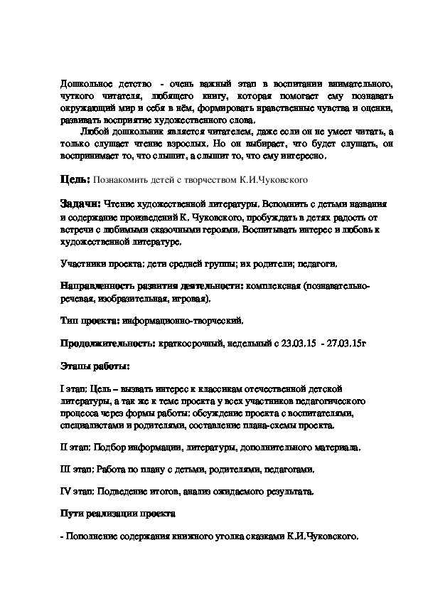 Цель проекта: Познакомить детей с творчеством К.И.Чуковского