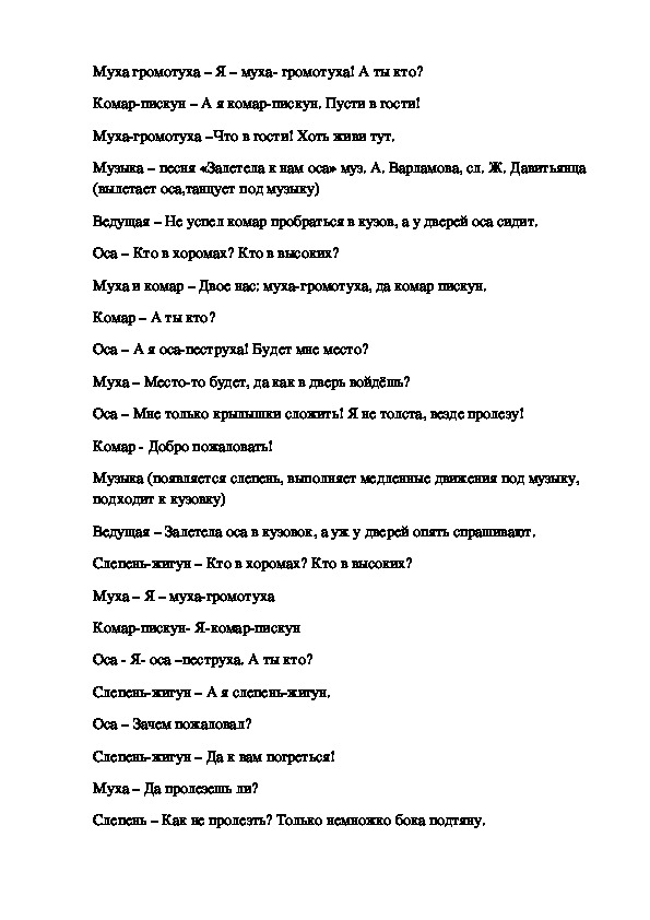 Комар – Я первый не полечу, я всех голосистее!Оса – Я первая не полечу, я всех наряднее!
