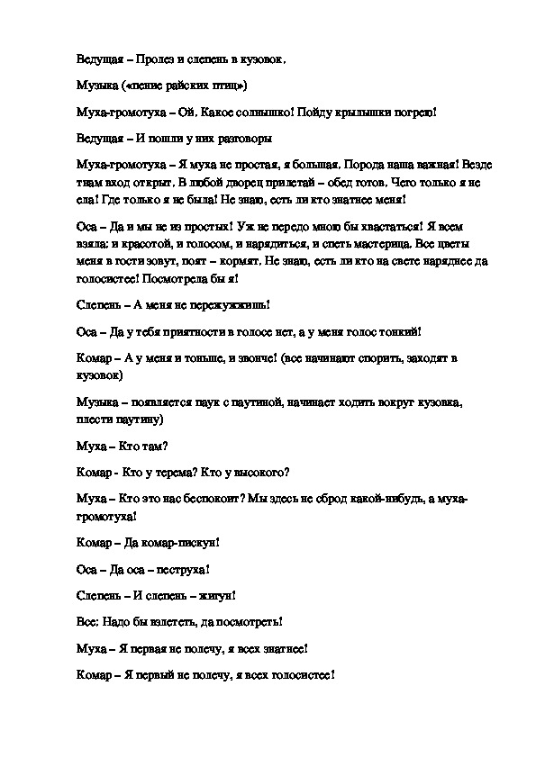 Ведущая: И стала в кузовке муха жить. Живёт день, живёт другой. И вылетать