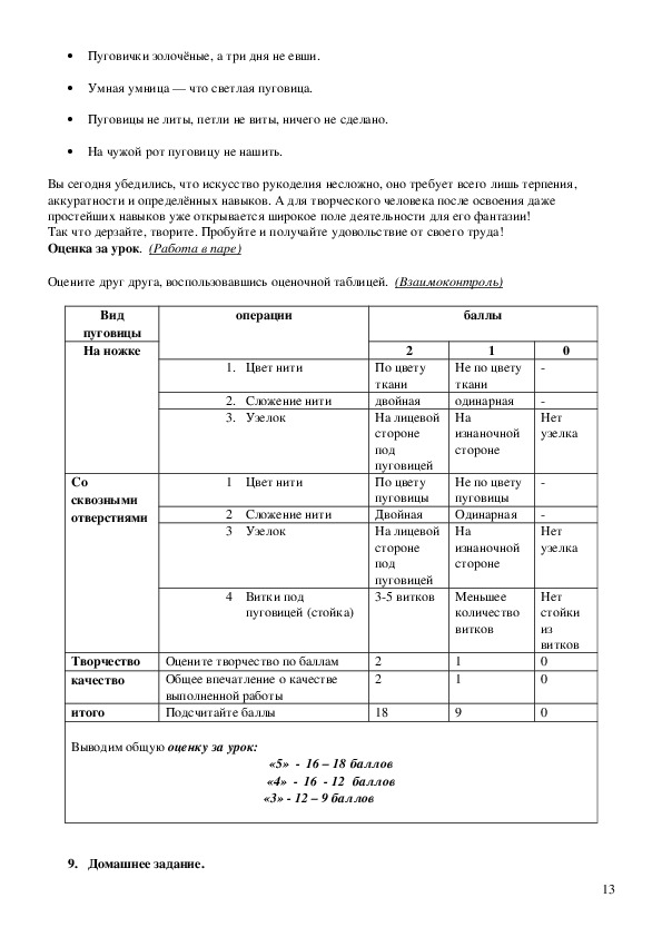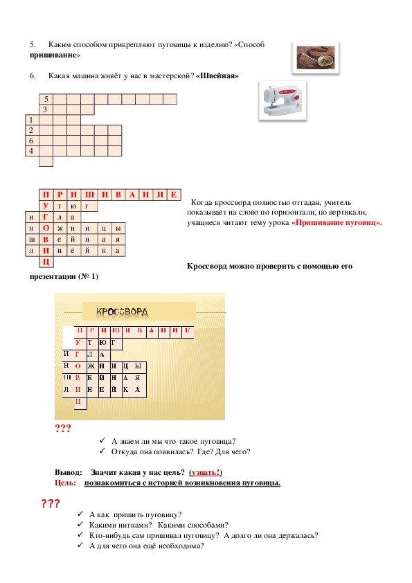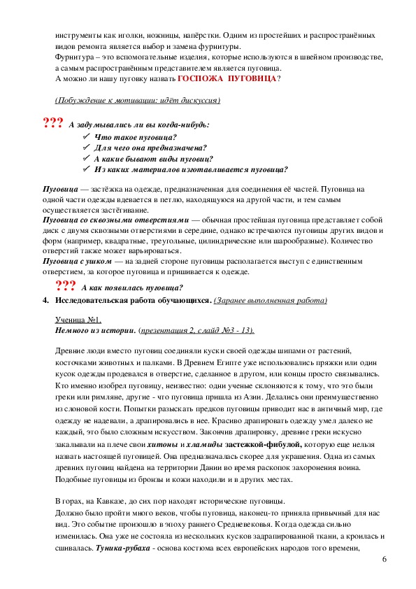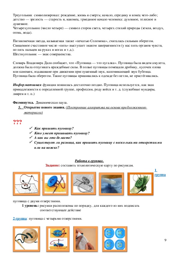 Цель: создание условий для изучения истории появления пуговицы, области её применения и правил пришивания к основе.