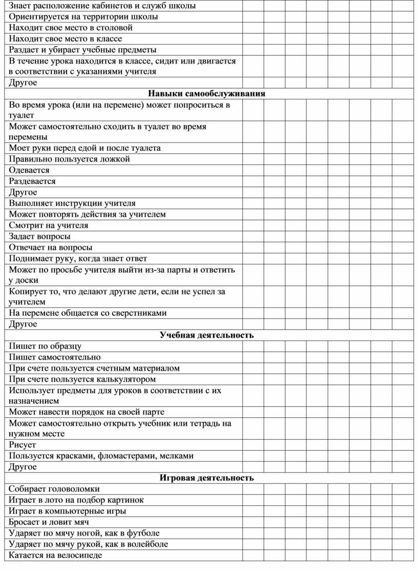 Заполнение этой таблицы позволяет также выявить существующие барьеры (например, невозможность самостоятельного передвижения ребенка по зданию или территории) и принять меры по созданию условий к возможностям ребенка. Если данных таблицы окажется недостаточно, в разделе «другое» дописывается позиция по каждому конкретному случаю.