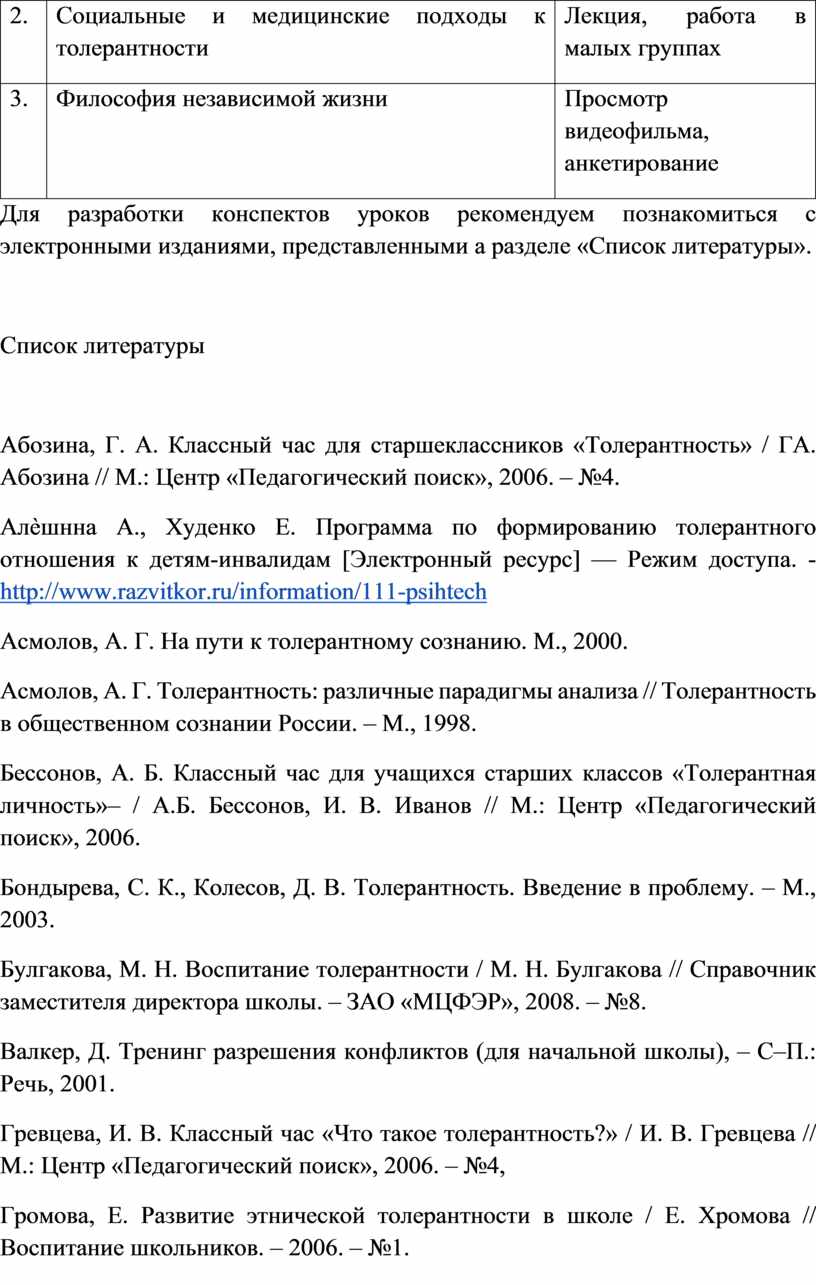 Абозина, Г. А. Классный час для старшеклассников «Толерантность» / ГА. Абозина // М.: Центр «Педагогический поиск», 2006. – №4.
