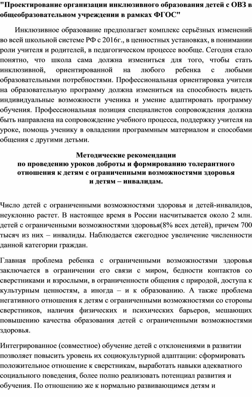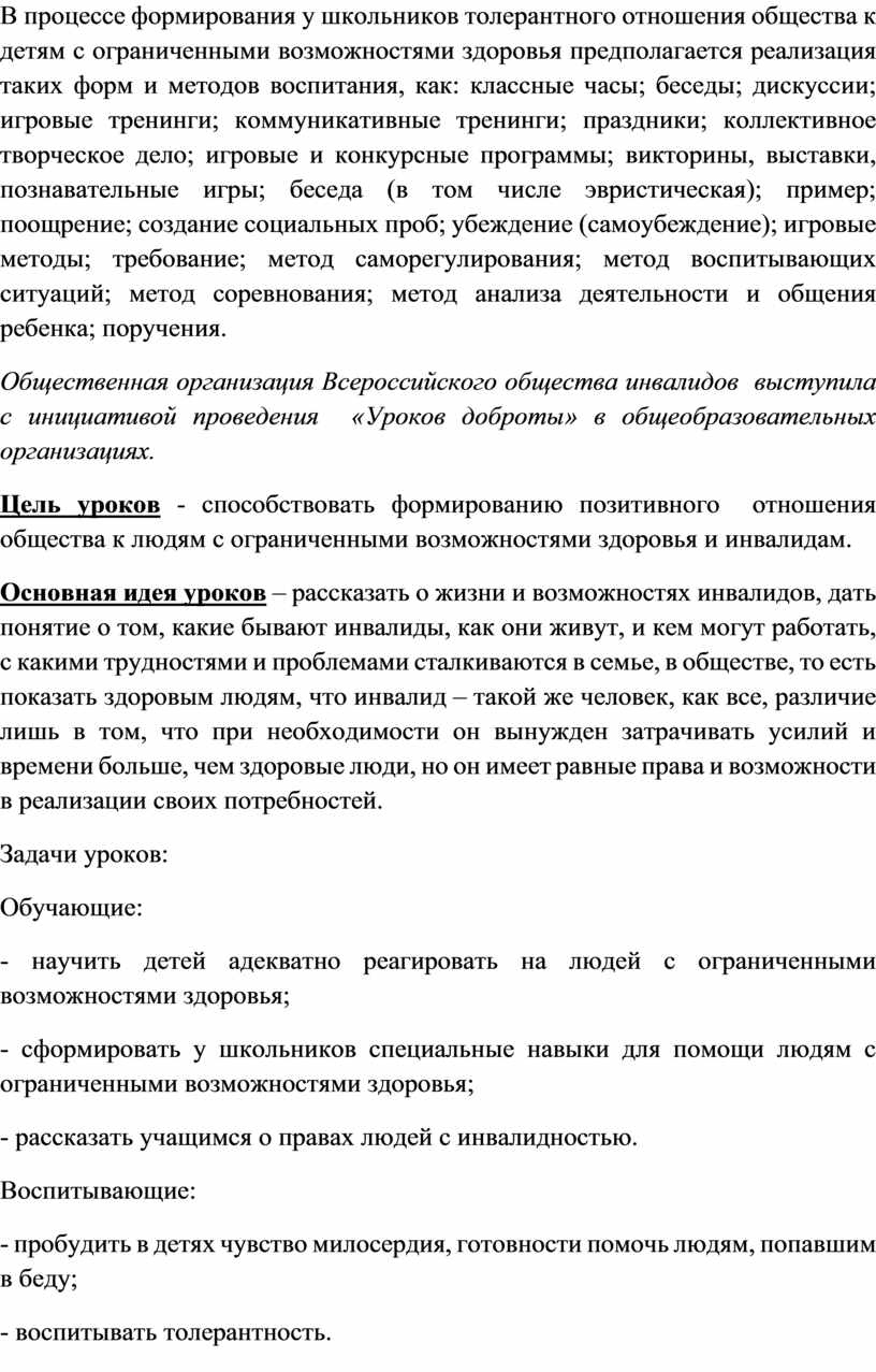 по проведению уроков доброты и формированию толерантного отношения к детям с ограниченными возможностями здоровья