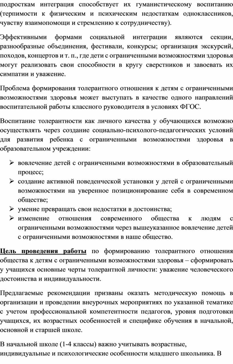 Цель проведения работы по формированию толерантного отношения общества к детям с ограниченными возможностями здоровья – сформировать у учащихся основные черты толерантной личности: уважение человеческого достоинства и индивидуальности.