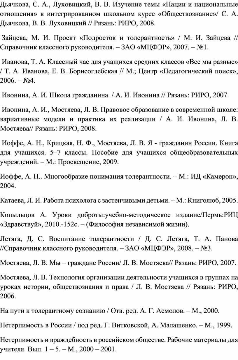 Дьячкова, С. А., Луховицкий, В. В. Изучение темы «Нации и национальные отношения» в интегрированном школьном курсе «Обществознание»/ С. А. Дьячкова, В. В. Луховицкий // Рязань: РИРО, 2008.