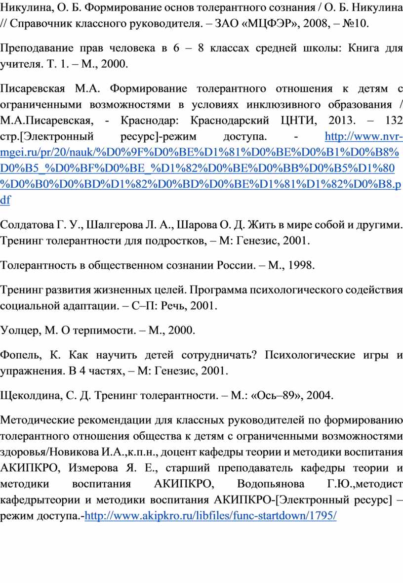 Писаревская М.А. Формирование толерантного отношения к детям с ограниченными возможностями в условиях инклюзивного образования / М.А.Писаревская, - Краснодар: Краснодарский ЦНТИ, 2013. – 132 стр.[Электронный ресурс]-режим доступа. - http://www.nvr-mgei.ru/pr/20/nauk/%D0%9F%D0%BE%D1%81%D0%BE%D0%B1%D0%B8%D0%B5_%D0%BF%D0%BE_%D1%82%D0%BE%D0%BB%D0%B5%D1%80%D0%B0%D0%BD%D1%82%D0%BD%D0%BE%D1%81%D1%82%D0%B8.pdf