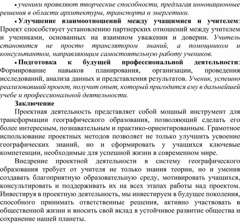 Внедрение проектной деятельности в систему географического образования требует от учителя не только знания теории, но и умения создавать благоприятную образовательную среду, мотивировать учащихся, консультировать и поддерживать их на всех этапах работы над проектом. Инвестируя в проектную деятельность, мы инвестируем в будущее поколения, способного принимать ответственные решения, активно участвовать в общественной жизни и вносить свой вклад в устойчивое развитие общества и сохранение нашей планеты.