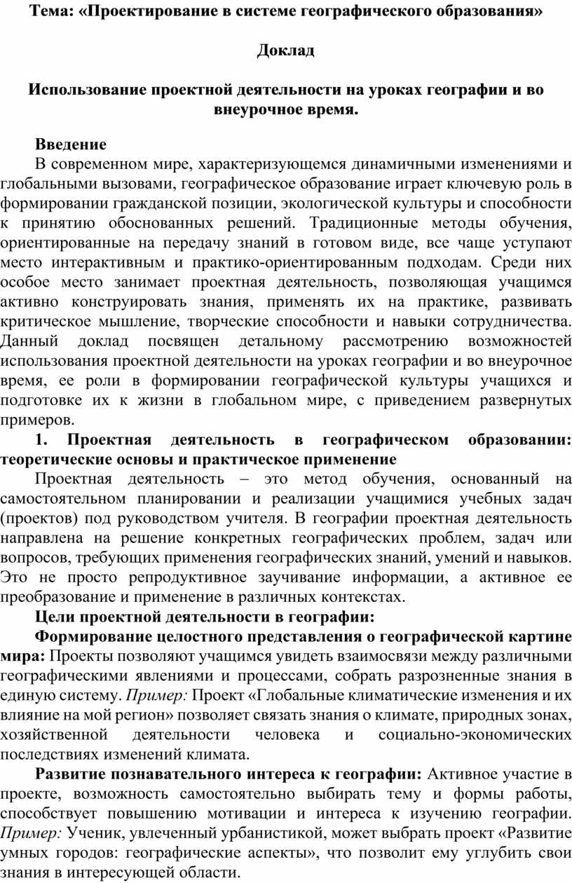 В современном мире, характеризующемся динамичными изменениями и глобальными вызовами, географическое образование играет ключевую роль в формировании гражданской позиции, экологической культуры и способности к принятию обоснованных решений. Традиционные методы обучения, ориентированные на передачу знаний в готовом виде, все чаще уступают место интерактивным и практико-ориентированным подходам. Среди них особое место занимает проектная деятельность, позволяющая учащимся активно конструировать знания, применять их на практике, развивать критическое мышление, творческие способности и навыки сотрудничества. Данный доклад посвящен детальному рассмотрению возможностей использования проектной деятельности на уроках географии и во внеурочное время, ее роли в формировании географической культуры учащихся и подготовке их к жизни в глобальном мире, с приведением развернутых примеров.
