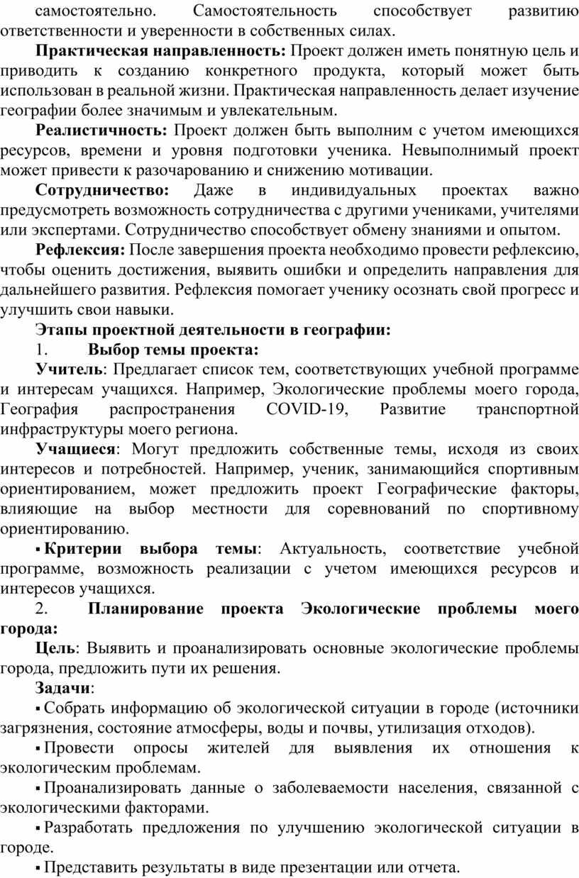 Практическая направленность: Проект должен иметь понятную цель и приводить к созданию конкретного продукта, который может быть использован в реальной жизни. Практическая направленность делает изучение географии более значимым и увлекательным.