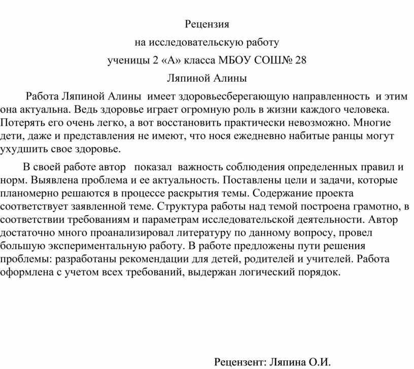 Работа Ляпиной Алины имеет здоровьесберегающую направленность и этим она актуальна. Ведь здоровье играет огромную роль в жизни каждого человека. Потерять его очень легко, а вот восстановить практически невозможно. Многие дети, даже и представления не имеют, что нося ежедневно набитые ранцы могут ухудшить свое здоровье.