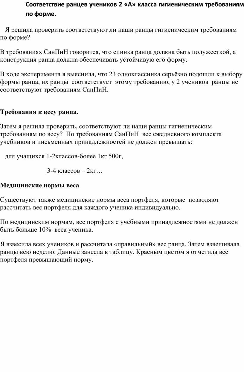 2. Выявить соответствуют ли ранцы учеников 2 «А» класса требованиям СанПиН по форме.