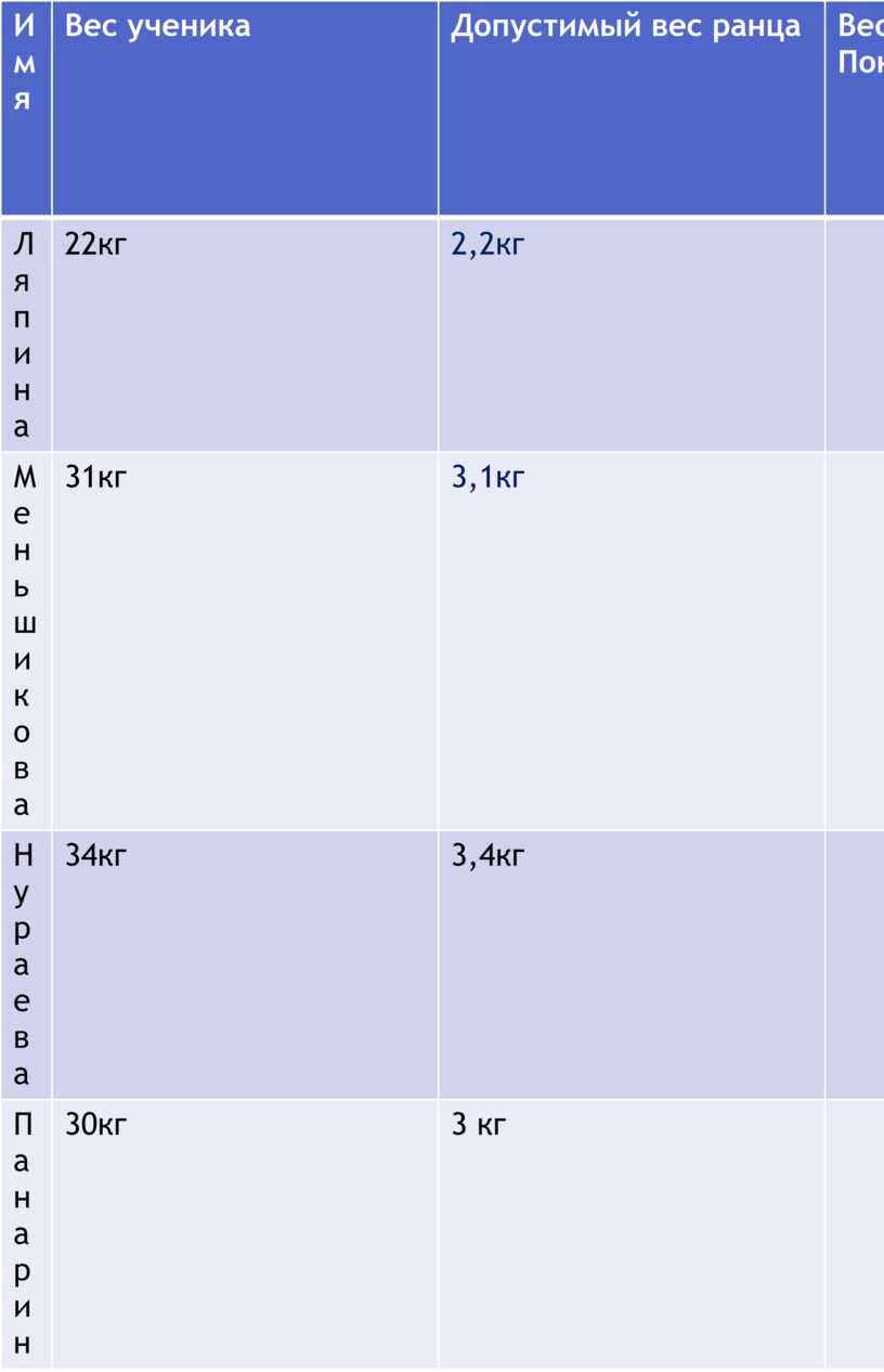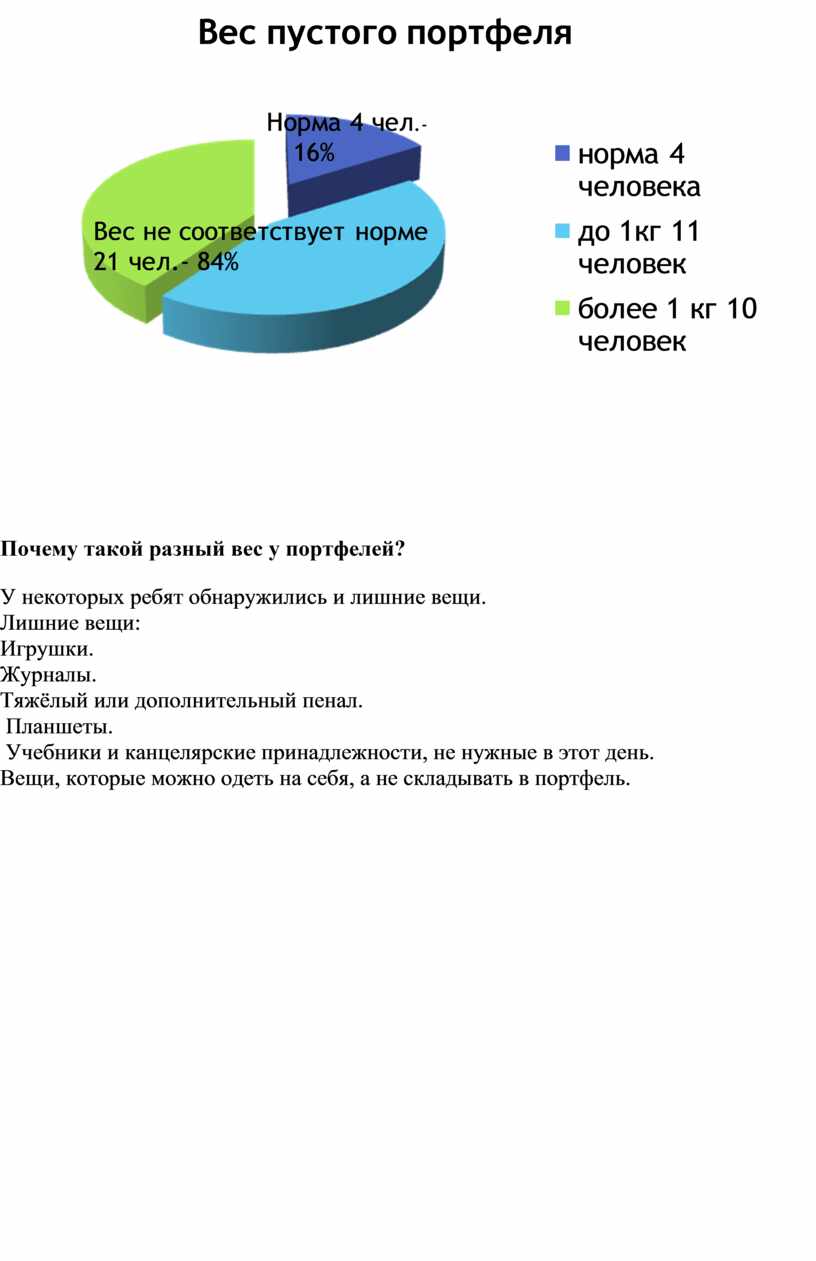 Существуют также медицинские нормы веса портфеля, которые позволяют рассчитать вес портфеля для каждого ученика индивидуально.