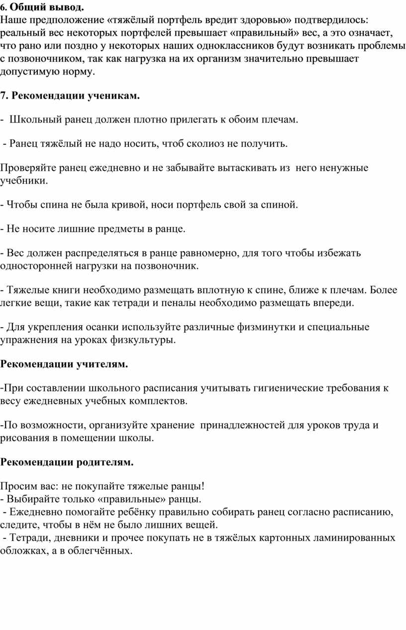 Наше предположение «тяжёлый портфель вредит здоровью» подтвердилось: реальный вес некоторых портфелей превышает «правильный» вес, а это означает, что рано или поздно у некоторых наших одноклассников будут возникать проблемы с позвоночником, так как нагрузка на их организм значительно превышает допустимую норму.