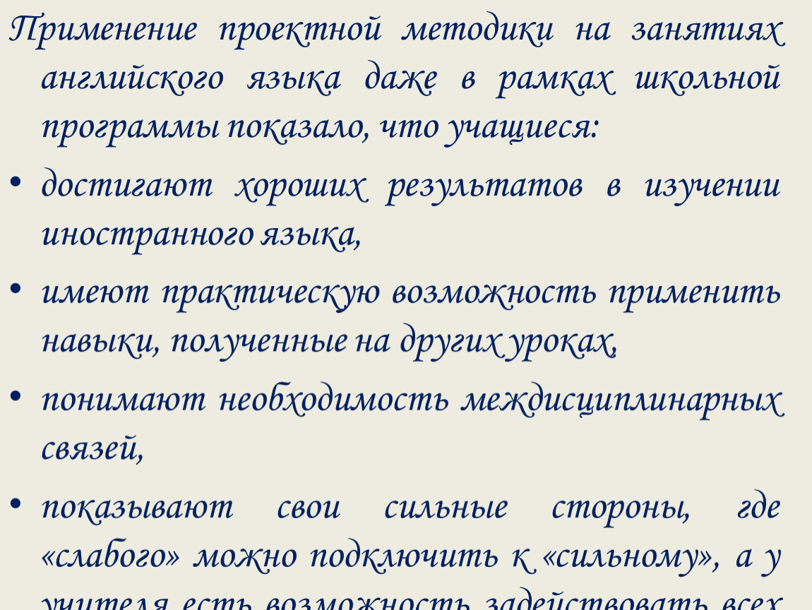 Применение проектной методики на занятиях английского языка даже в рамках школьной программы показало, что учащиеся: