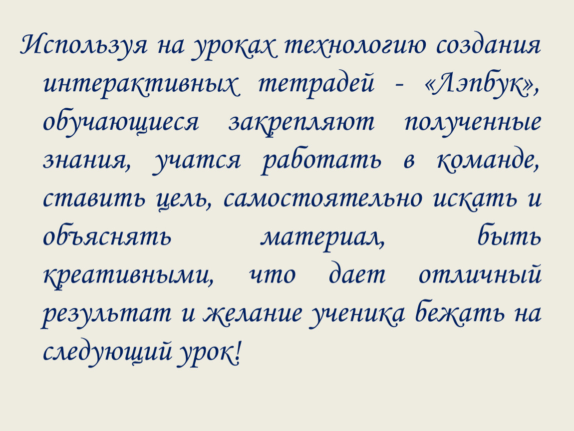 Используя на уроках технологию создания интерактивных тетрадей - «Лэпбук», обучающиеся закрепляют полученные знания, учатся работать в команде, ставить цель, самостоятельно искать и объяснять материал, быть креативными, что дает отличный результат и желание ученика бежать на следующий урок!