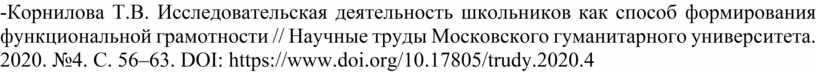 -Корнилова Т.В. Исследовательская деятельность школьников как способ формирования функциональной грамотности // Научные труды Московского гуманитарного университета. 2020. №4. С. 56–63. DOI: https://www.doi.org/10.17805/trudy.2020.4