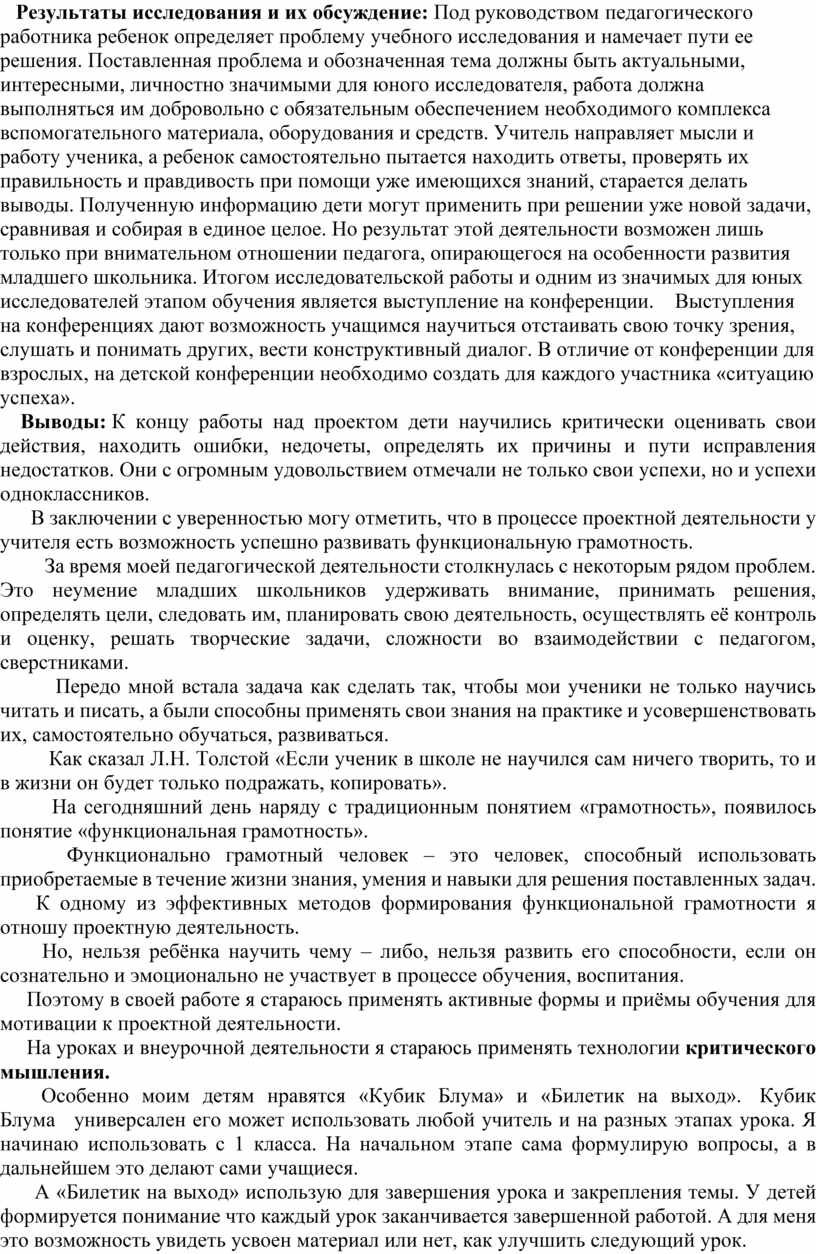 Результаты исследования и их обсуждение: Под руководством педагогического работника ребенок определяет проблему учебного исследования и намечает пути ее решения. Поставленная проблема и обозначенная тема должны быть актуальными, интересными, личностно значимыми для юного исследователя, работа должна выполняться им добровольно с обязательным обеспечением необходимого комплекса вспомогательного материала, оборудования и средств. Учитель направляет мысли и работу ученика, а ребенок самостоятельно пытается находить ответы, проверять их правильность и правдивость при помощи уже имеющихся знаний, старается делать выводы. Полученную информацию дети могут применить при решении уже новой задачи, сравнивая и собирая в единое целое. Но результат этой деятельности возможен лишь только при внимательном отношении педагога, опирающегося на особенности развития младшего школьника. Итогом исследовательской работы и одним из значимых для юных исследователей этапом обучения является выступление на конференции. Выступления на конференциях дают возможность учащимся научиться отстаивать свою точку зрения, слушать и понимать других, вести конструктивный диалог. В отличие от конференции для взрослых, на детской конференции необходимо создать для каждого участника «ситуацию успеха».