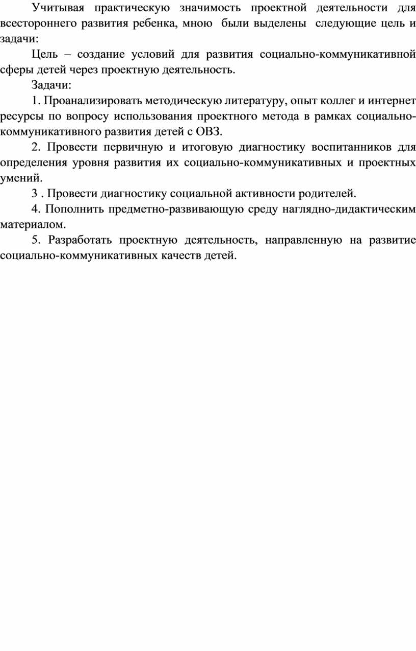 1. Проанализировать методическую литературу, опыт коллег и интернет ресурсы по вопросу использования проектного метода в рамках социально-коммуникативного развития детей с ОВЗ.