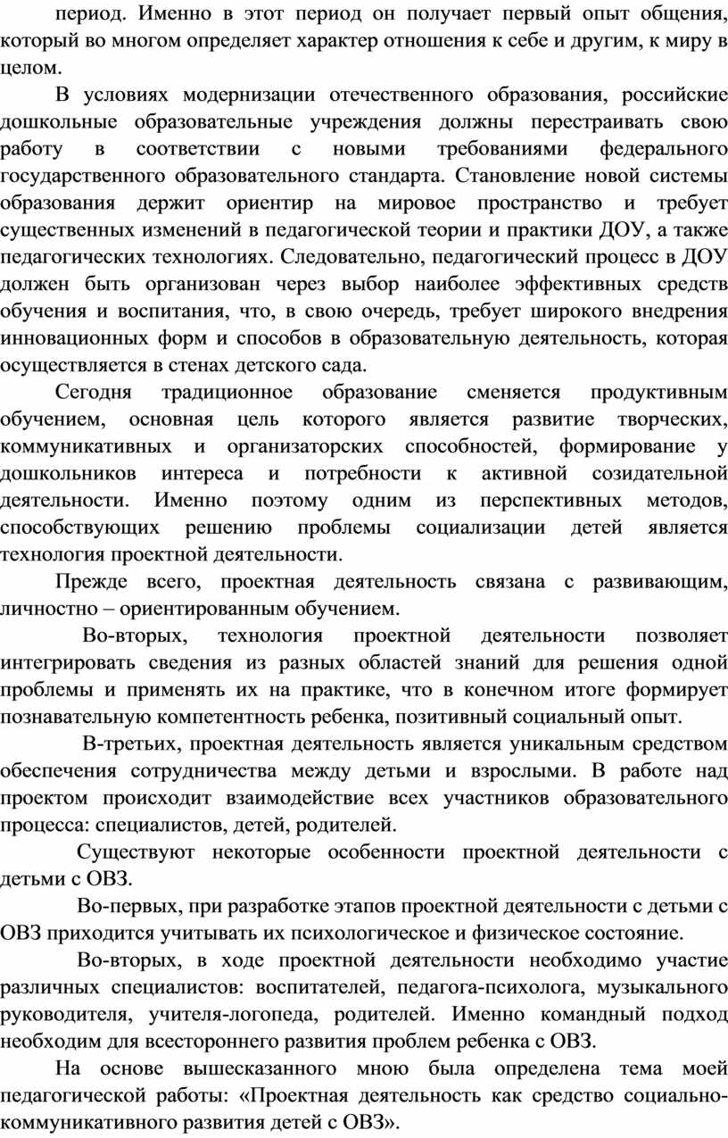 На основе вышесказанного мною была определена тема моей педагогической работы: «Проектная деятельность как средство социально-коммуникативного развития детей с ОВЗ».