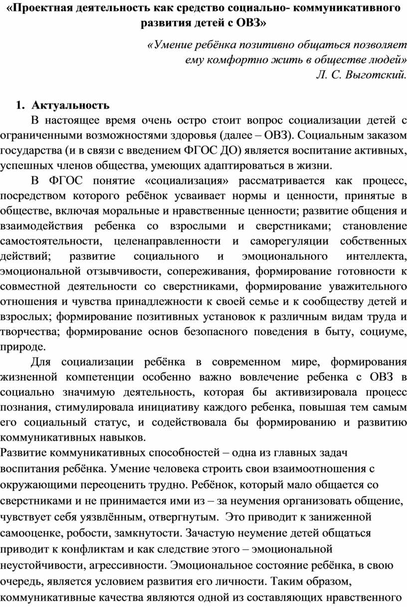 «Проектная деятельность как средство социально- коммуникативного развития детей с ОВЗ»