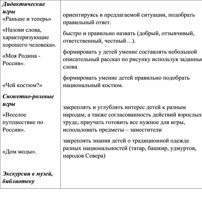закреплять и углублять интерес детей к разным народам, а также согласованность действий взрослых в труде, приучать готовить все нужное для игры, использовать предметы – заместители закреплять знания детей о традиционной одежде разных национальностей (татар, башкир, удмуртов, народов Севера) |
