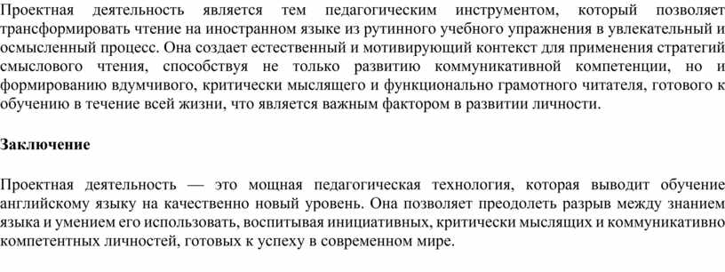 Систематическое использование проектной деятельности приводит к качественному скачку в развитии читательской грамотности. Работа над интересным, личностно значимым проектом повышает внутреннюю мотивацию к чтению на иностранном языке. Чтение становится не самоцелью, а средством для достижения практического результата.