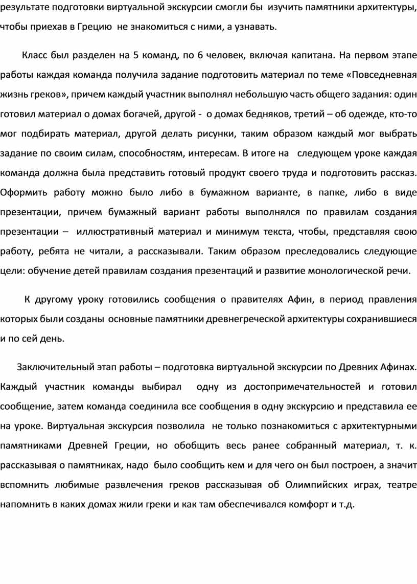 Заключительный этап работы – подготовка виртуальной экскурсии по Древних Афинах. Каждый участник команды выбирал одну из достопримечательностей и готовил сообщение, затем команда соединила все сообщения в одну экскурсию и представила ее на уроке. Виртуальная экскурсия позволила не только познакомиться с архитектурными памятниками Древней Греции, но обобщить весь ранее собранный материал, т. к. рассказывая о памятниках, надо было сообщить кем и для чего он был построен, а значит вспомнить любимые развлечения греков рассказывая об Олимпийских играх, театре напомнить в каких домах жили греки и как там обеспечивался комфорт и т.д.