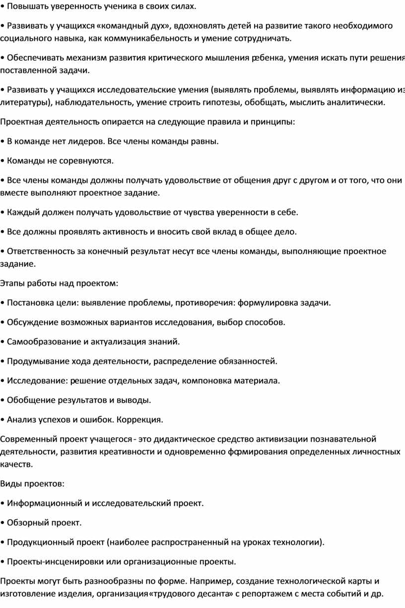 Организация проектной деятельности создает учителю благоприятные условия для решения проблемы гуманизации образования. Учебный предмет «Технология» обеспечивает формирование культуры труда, технологической культуры, практических знаний и умений. Это позволяет учащимся успешно адаптироваться в современной технологической среде, активно участвовать в ее преобразовании и самореализоваться в окружающем мире.
