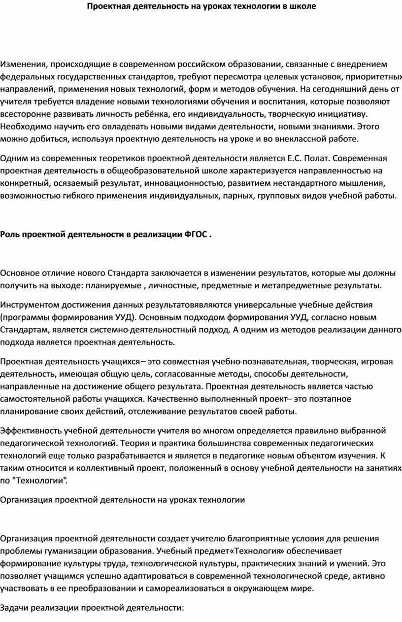Одним из современных теоретиков проектной деятельности является Е.С. Полат. Современная проектная деятельность в общеобразовательной школе характеризуется направленностью на конкретный, осязаемый результат, инновационностью, развитием нестандартного мышления, возможностью гибкого применения индивидуальных, парных, групповых видов учебной работы.