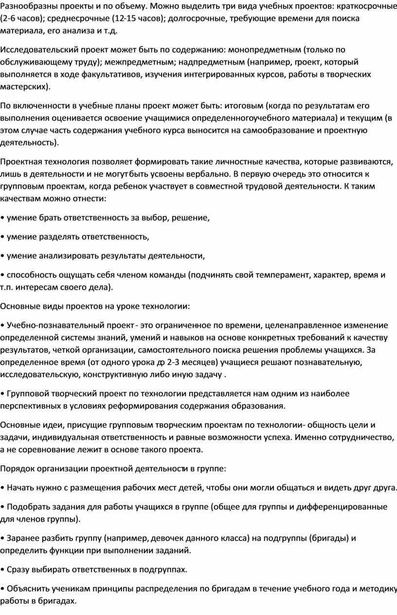 Разнообразны проекты и по объему. Можно выделить три вида учебных проектов: краткосрочные (2-6 часов); среднесрочные (12-15 часов); долгосрочные, требующие времени для поиска материала, его анализа и т.д.