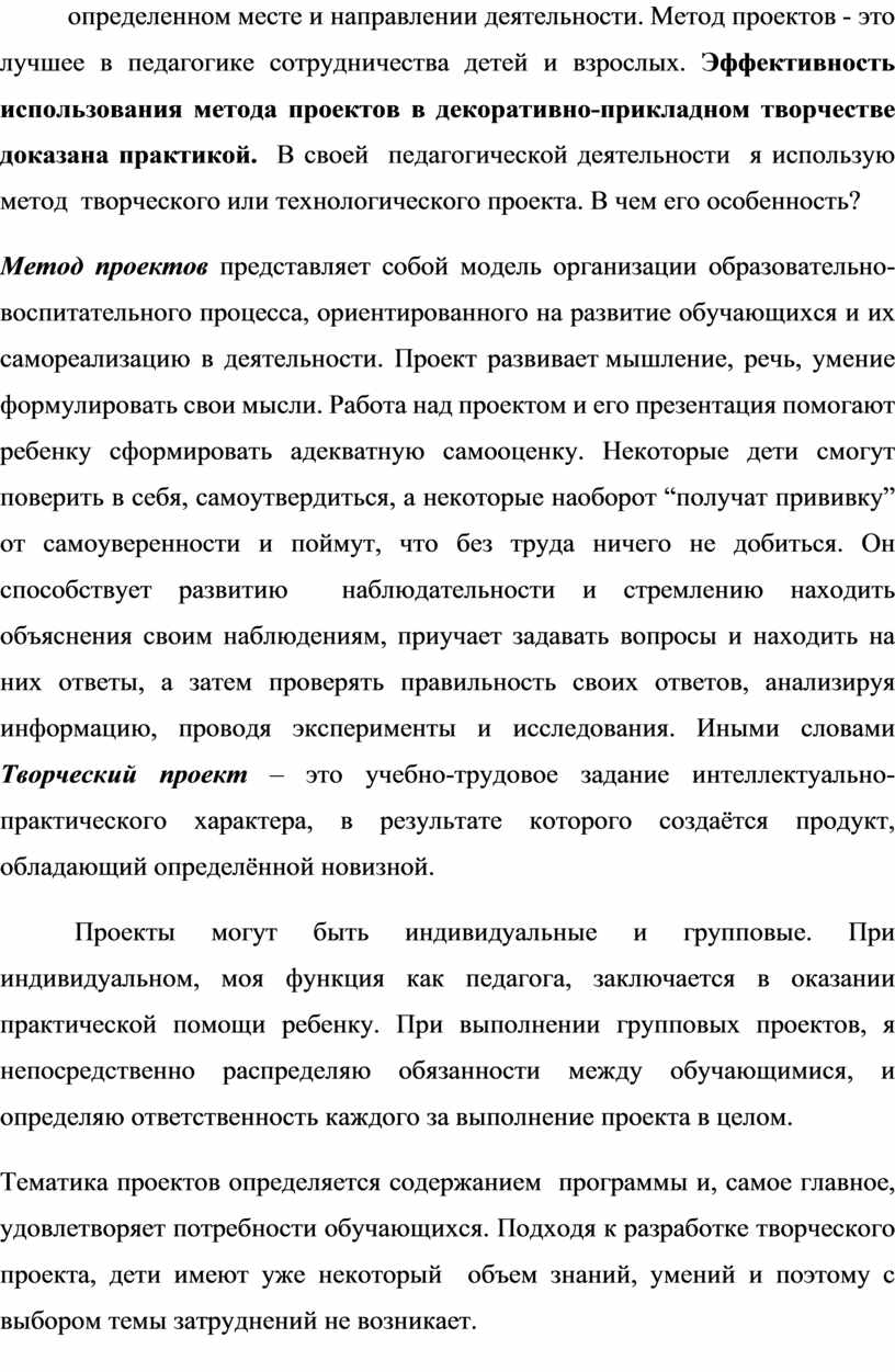 В современной практике существует множество педагогических технологий. Все они хороши по-своему. Каждая из них эффективна в определенном месте и направлении деятельности. Метод проектов - это лучшее в педагогике сотрудничества детей и взрослых. Эффективность использования метода проектов в декоративно-прикладном творчестве доказана практикой. В своей педагогической деятельности я использую метод творческого или технологического проекта. В чем его особенность?