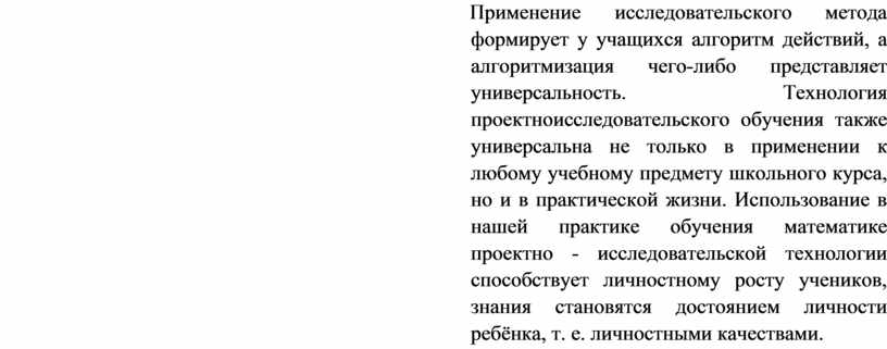 Применение исследовательского метода формирует у учащихся алгоритм действий, а алгоритмизация чего-либо представляет универсальность. Технология проектноисследовательского обучения также универсальна не только в применении к любому учебному предмету школьного курса, но и в практической жизни. Использование в нашей практике обучения математике проектно - исследовательской технологии способствует личностному росту учеников, знания становятся достоянием личности ребёнка, т. е. личностными качествами.