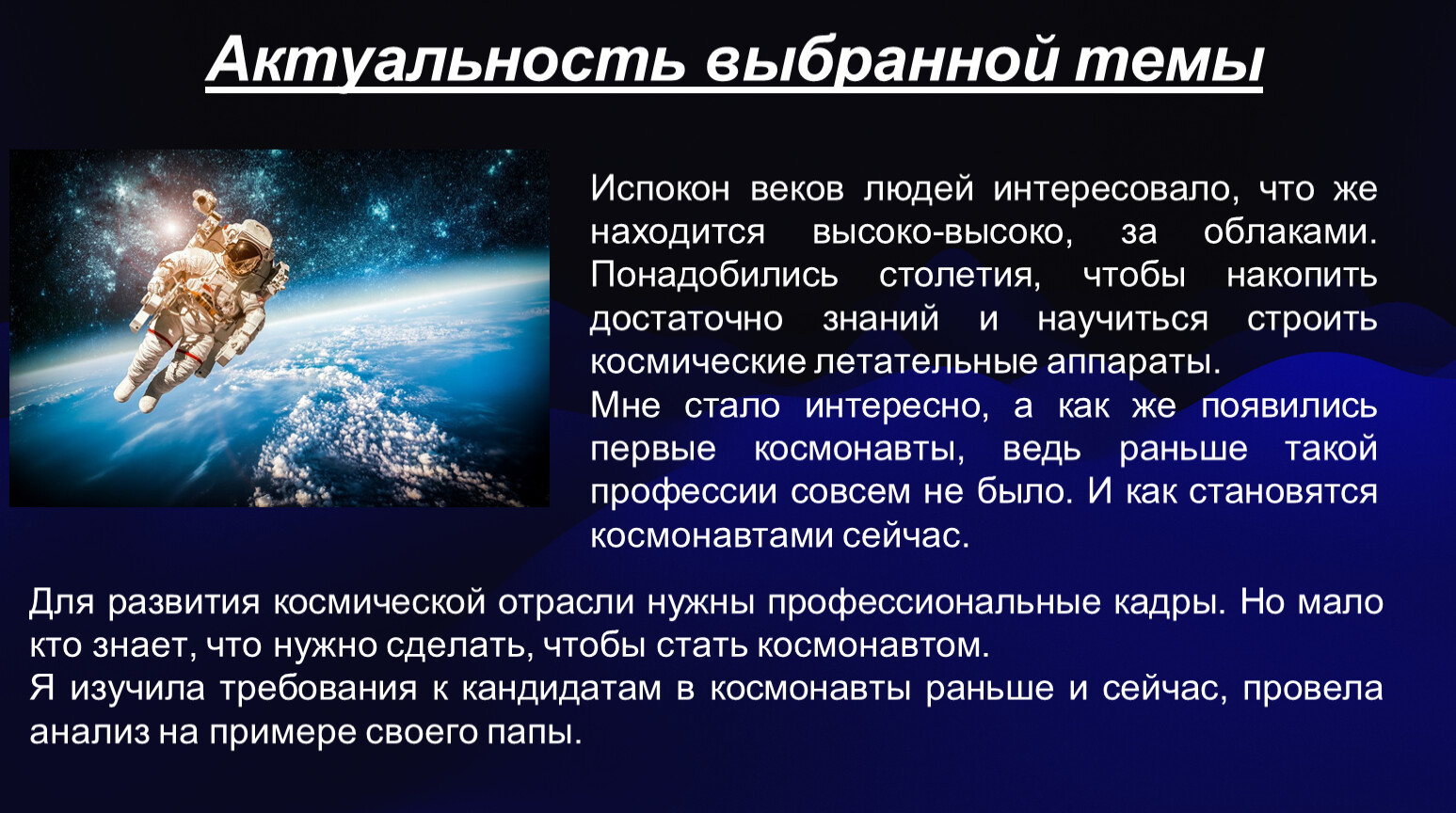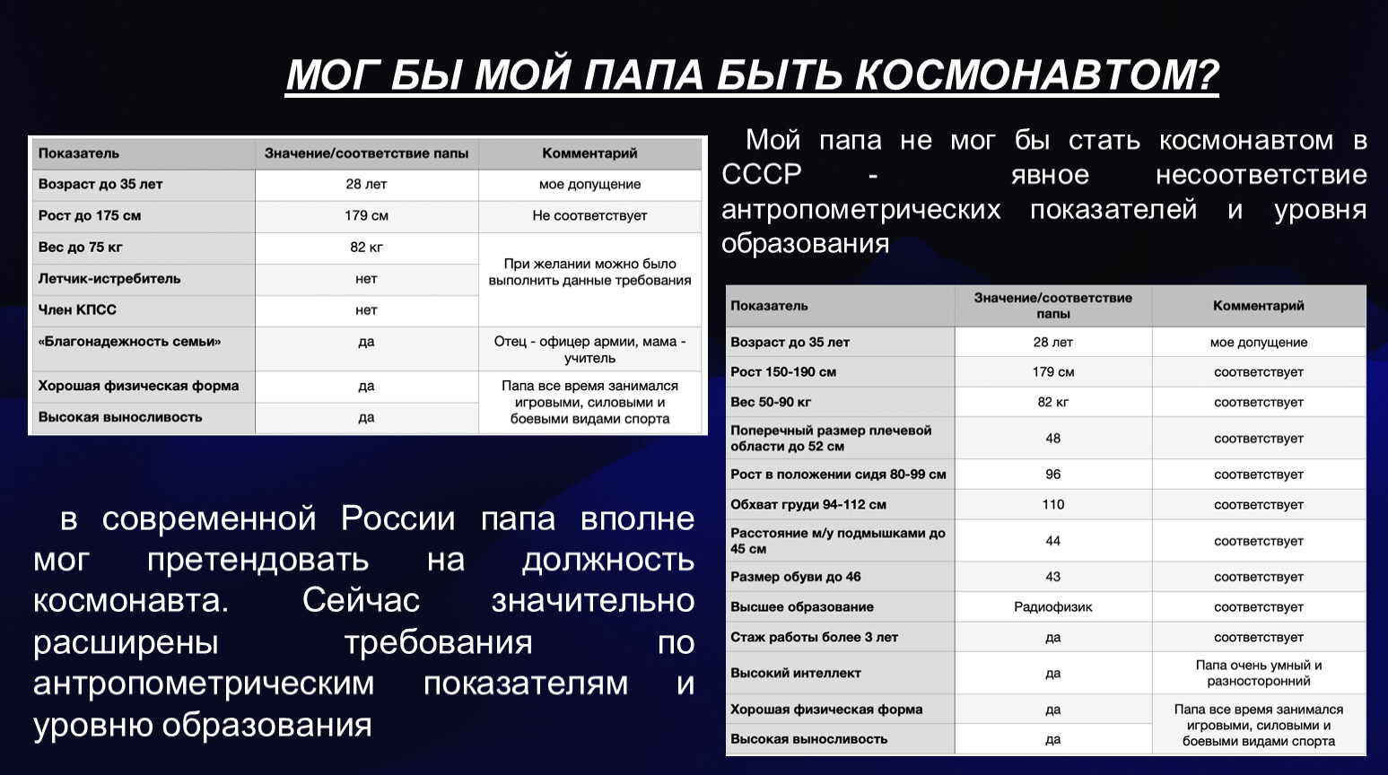 Я изучила требования к кандидатам в космонавты раньше и сейчас, провела анализ на примере своего папы.