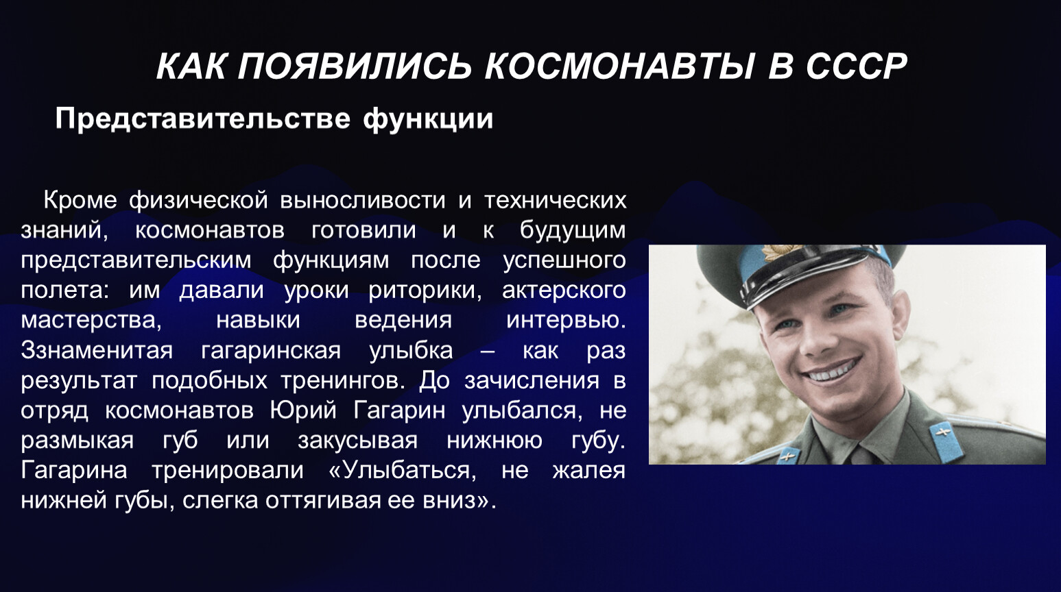 Кроме физической выносливости и технических знаний, космонавтов готовили и к будущим представительским функциям после успешного полета: им давали уроки риторики, актерского мастерства, навыки ведения интервью. Ззнаменитая гагаринская улыбка – как раз результат подобных тренингов. До зачисления в отряд космонавтов Юрий Гагарин улыбался, не размыкая губ или закусывая нижнюю губу. Гагарина тренировали «Улыбаться, не жалея нижней губы, слегка оттягивая ее вниз».