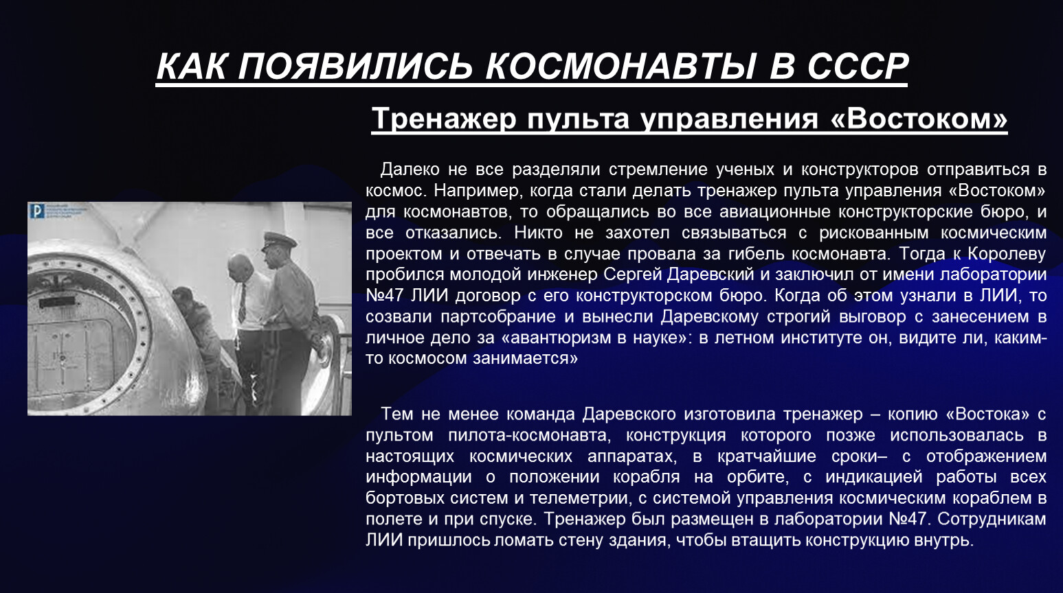 Далеко не все разделяли стремление ученых и конструкторов отправиться в космос. Например, когда стали делать тренажер пульта управления «Востоком» для космонавтов, то обращались во все авиационные конструкторские бюро, и все отказались. Никто не захотел связываться с рискованным космическим проектом и отвечать в случае провала за гибель космонавта. Тогда к Королеву пробился молодой инженер Сергей Даревский и заключил от имени лаборатории №47 ЛИИ договор с его конструкторском бюро. Когда об этом узнали в ЛИИ, то созвали партсобрание и вынесли Даревскому строгий выговор с занесением в личное дело за «авантюризм в науке»: в летном институте он, видите ли, каким-то космосом занимается»