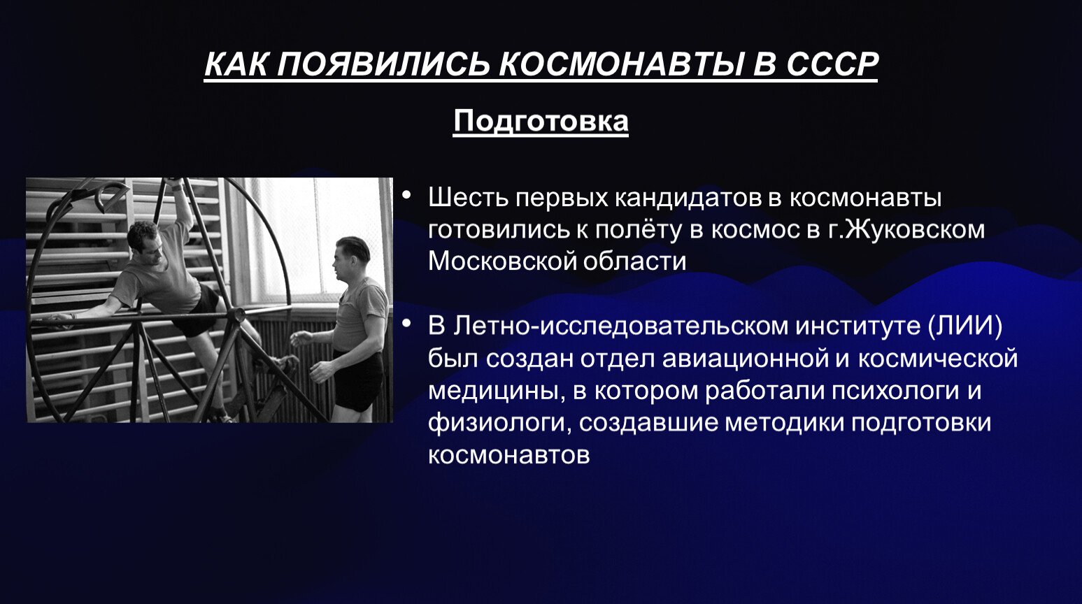 В Летно-исследовательском институте (ЛИИ) был создан отдел авиационной и космической медицины, в котором работали психологи и физиологи, создавшие методики подготовки космонавтов